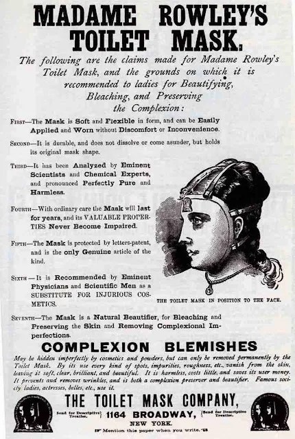 I absolutely love this ad. Madame Rowley’s Toilet Mask dates back to approximately 1887. Helen Rowley from Van Wert, Ohio patented this bizarre piece of beauty history in 1875. She called it a “Mask for Medical Purposes” and claimed that it would “excite perspiration with a view to soften and clarify the skin.” It is… Continue reading Madame Rowley’s Toilet Mask