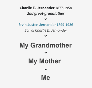 Carl Arvin “Charlie” Jernander is one of my great-great grandfathers. Charlie’s parents were both immigrants. His father, Carl Gustaf Jernander, came to the US in 1868 from Sweden; his mother, Hansine Pauline Andreasdr, from Norway in 1870.