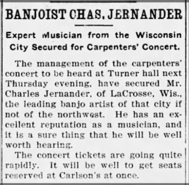 Charlie was born April 5, 1877 in Rochester, Minnesota. He was the 3rd child of 12 in the family. In Rochester, the family lived with Carl Sr.’s older brother, Anders Emil Jernander. Emil was an inventor and had a patent on a “Machine For Cleaning or Scouring Wheat.”