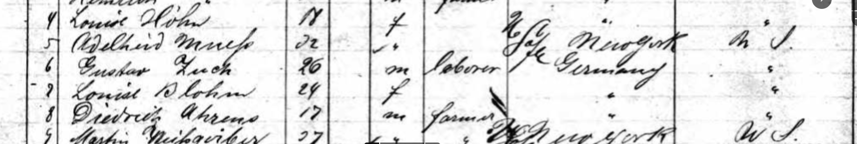 Gustav served for three years in the German army, and served specifically during the Franco-Prussian War. According to his short biography in the book mentioned above, he “… had taken part in many important military movements but had never suffered from any material injuries.” After an honorable discharge, Gustav chose to leave Germany. He departed from Bremen on the S.S. Weser in 1872. Unfortunately, the manifest doesn’t provide much information that we didn’t already know. From this we can tell he didn’t travel with family (at least family that has the same last name). Most manifests during this time period also collected information on who the immigrant was meeting with in the US. Although we know he eventually ended up in Greenfield living with his brother (according to his obituary), this specific manifest didn’t collect that type of information.