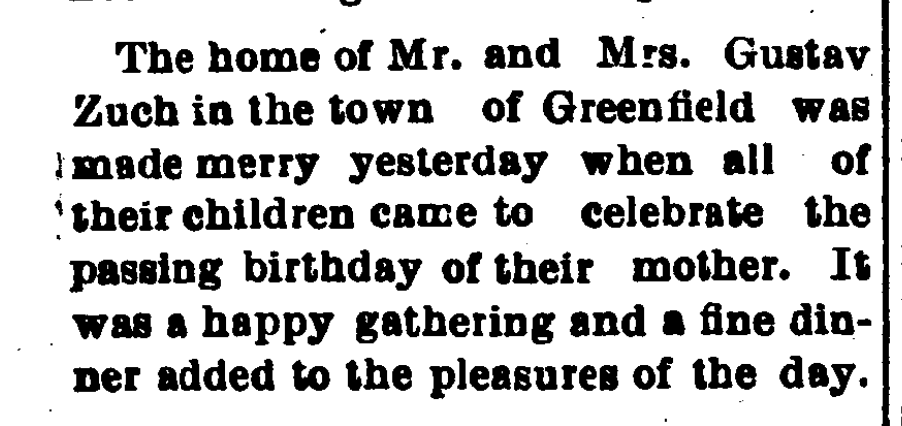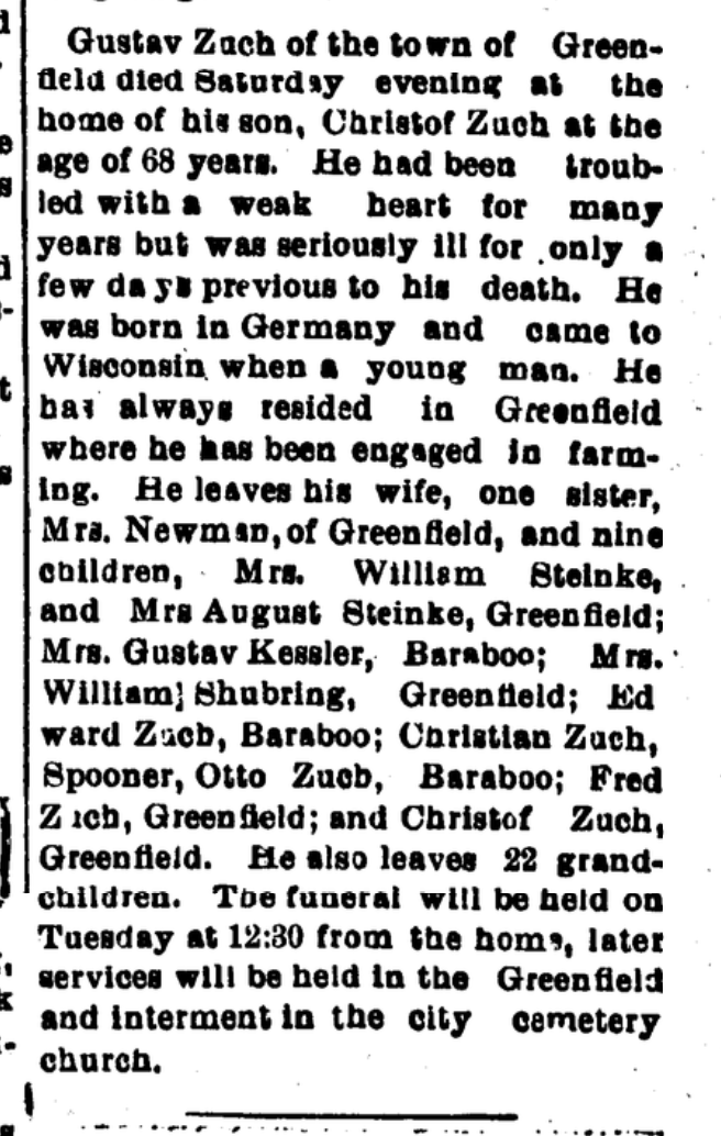 Gustav Zuch is another one of our immigrant ancestors. According to his obituary (shown below), he was born January 9, 1846 in West Prussia. I know “West Prussia” is less than specific. Unfortunately, we don’t know much more than that. I was unable to find Gustav’s birth or baptism records. Most of this information has been destroyed.